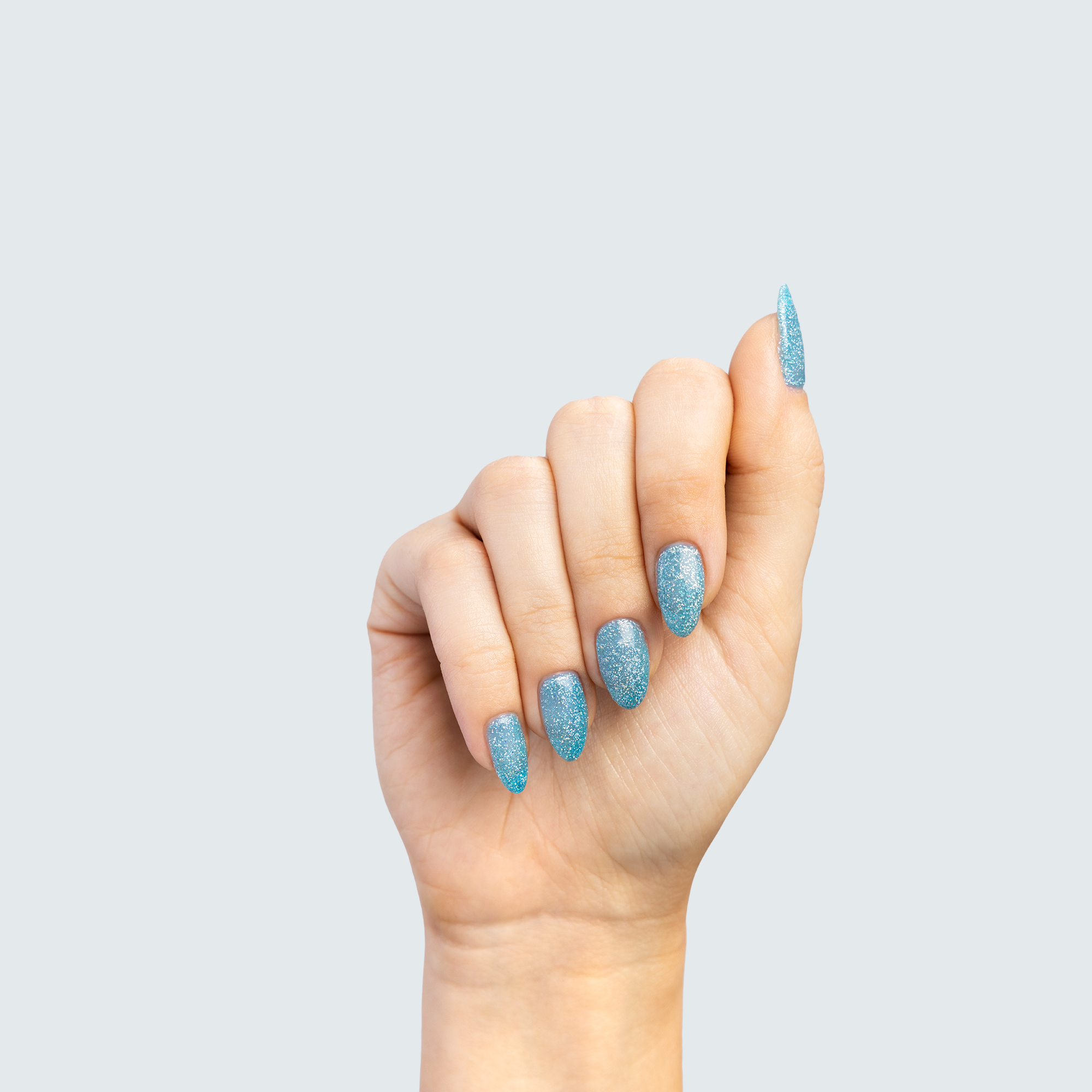 Azure blue. Light. Sheer. Shimmer. Cold undertone.