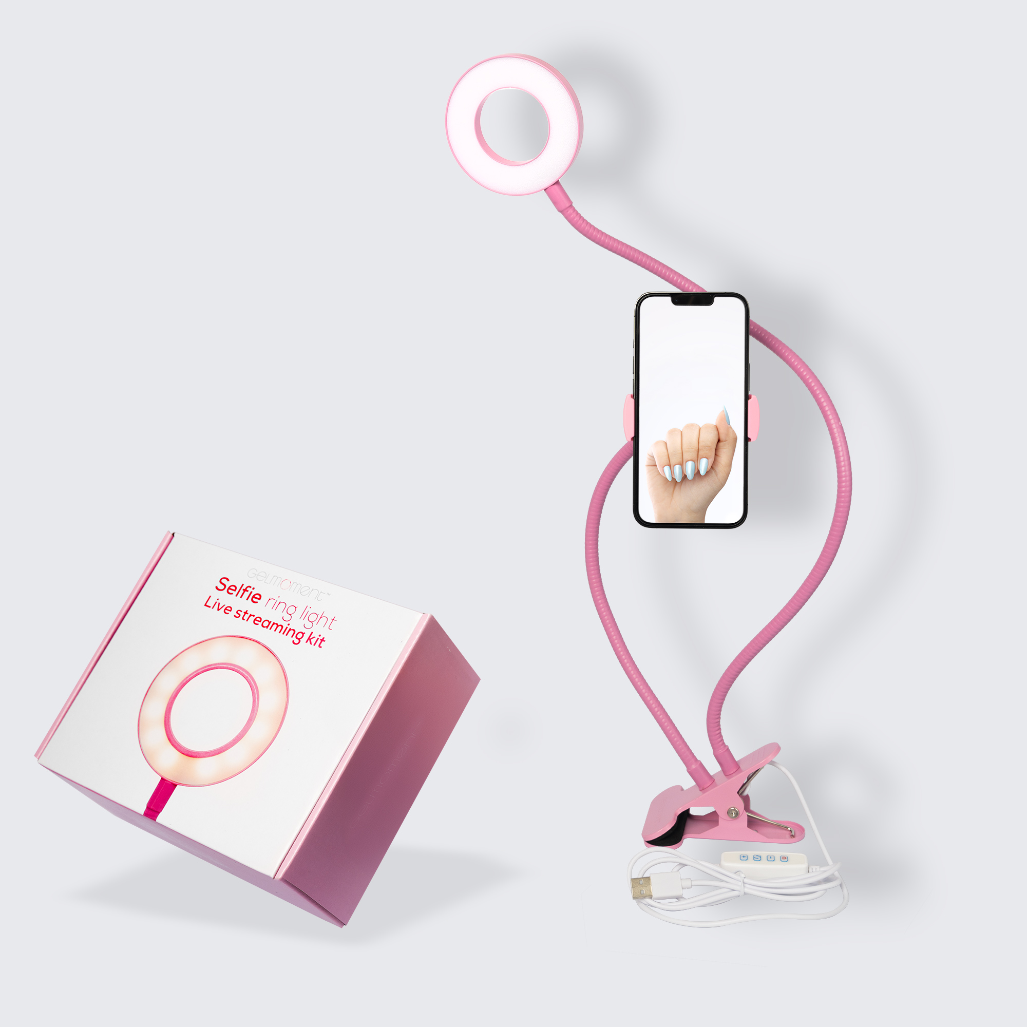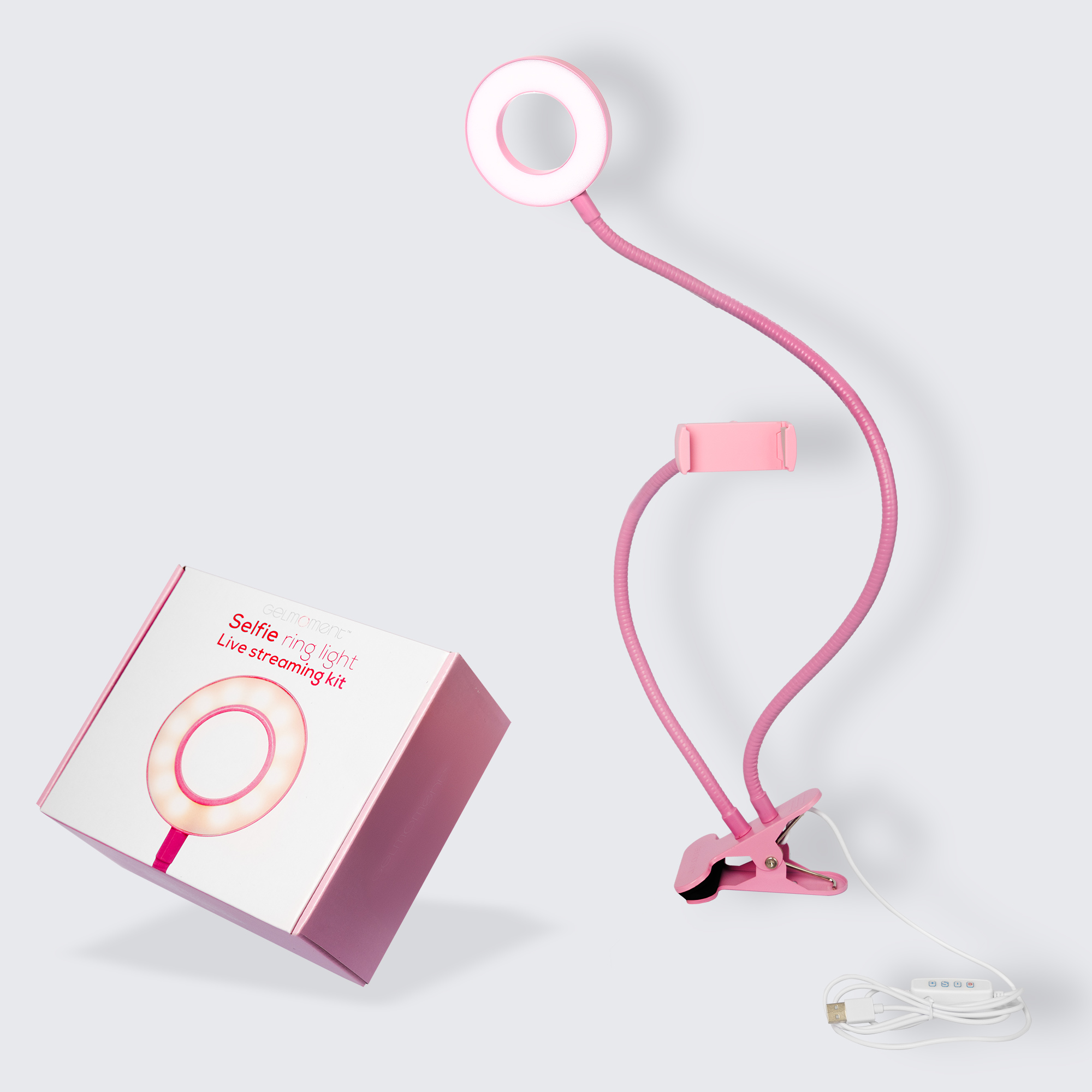 Do you want to be able to record or take pictures like the pros? Use this GelMoment clip-on combination phone holder and selfie ring light. With flexible goose-neck holder and light, you can direct your cell phone toward you for hands-free selfies and videos, or down toward your tabletop for close-up manicure pictures or tutorials. Powered by any USB power source, its adjustable lighting in 3 colours and 10 levels of brightness means you will be able to create stunning visuals in any environment. USB powered.